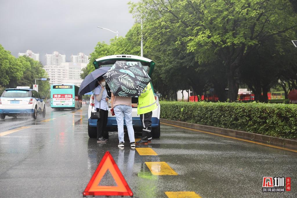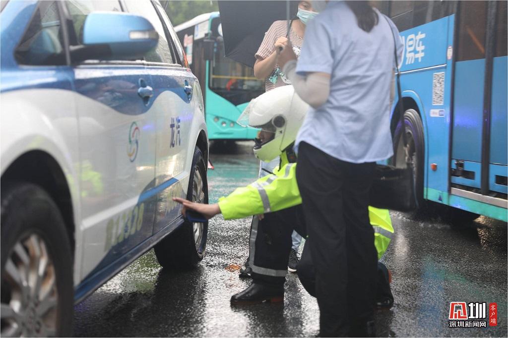 深圳交警雨中處理交通事故。