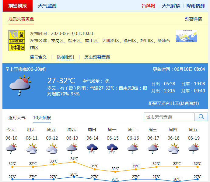 市氣象臺(tái)預(yù)測(cè),10日我市(含深汕)多云,有短時(shí)(雷)陣雨,局部大雨,本輪“龍舟水”過(guò)程趨于結(jié)束。11-13日多云,有短時(shí)(雷)陣雨,天氣漸趨悶熱。