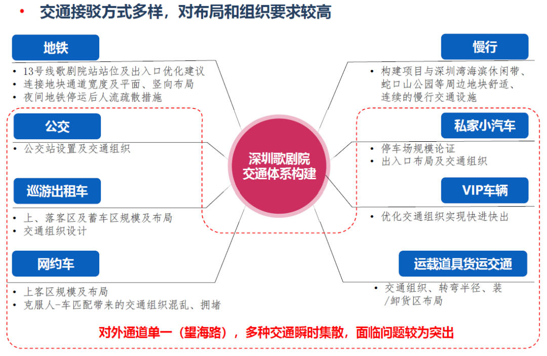肯定了目前交通組織的總體方案,提出需充分利用地面望海路的交通疏散功能,考慮歌劇院作為地標景點的吸引力,適當增加停車位的彈性及可達性。同時建議市交通運輸局需結合深圳歌劇院的建設重新對望海路地下快速路的規(guī)劃方案開展研究工作。