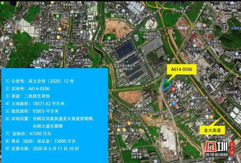 光明A614-0506宗地位于光明區(qū)鳳凰街道龍大高速西南側、光明大道東南側,土地用途為二類居住用地,起始價為6.72億元,土地面積為18571.62平方米,建筑面積為9.29萬平方米。該宗地建設住宅類型為出售的人才住房,項目建成后宗地出售的人才住房銷售基準售價不高于2.9萬元/平方米,最高售價不高于3.05萬元/平方米。