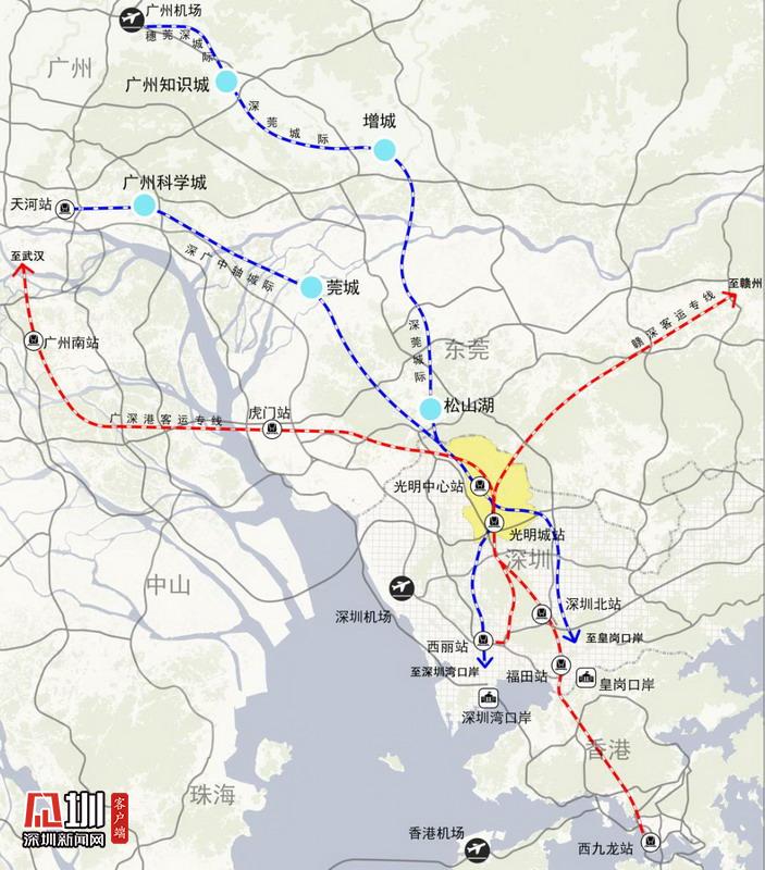 完善產(chǎn)學(xué)研結(jié)合的共享服務(wù)。光明科學(xué)城將建設(shè)產(chǎn)業(yè)服務(wù)中心和產(chǎn)業(yè)創(chuàng)新轉(zhuǎn)化服務(wù)平臺(tái),鼓勵(lì)企業(yè)開放圍墻,增加沿街界面,鼓勵(lì)土地混合利用,提升產(chǎn)城融合水平,增加城市活力,促進(jìn)產(chǎn)業(yè)創(chuàng)新。在交通網(wǎng)絡(luò)方面,光明科學(xué)城依托中深惠城際、深莞城際和城市軌道,加強(qiáng)與深圳寶安國(guó)際機(jī)場(chǎng)、廣州白云國(guó)際機(jī)場(chǎng)的快速聯(lián)系;依托廣深港客專、深莞城際、深廣中軸城際和城市軌道,加強(qiáng)與香港西九龍口岸、深圳灣口岸、皇崗口岸、福田口岸等的便捷聯(lián)系;加快深廣中軸城際、深莞城際軌道規(guī)劃建設(shè),推動(dòng)深莞城際與深廣中軸城際、中深惠城際、中虎龍城際和莞惠城際的“互聯(lián)互通”。
