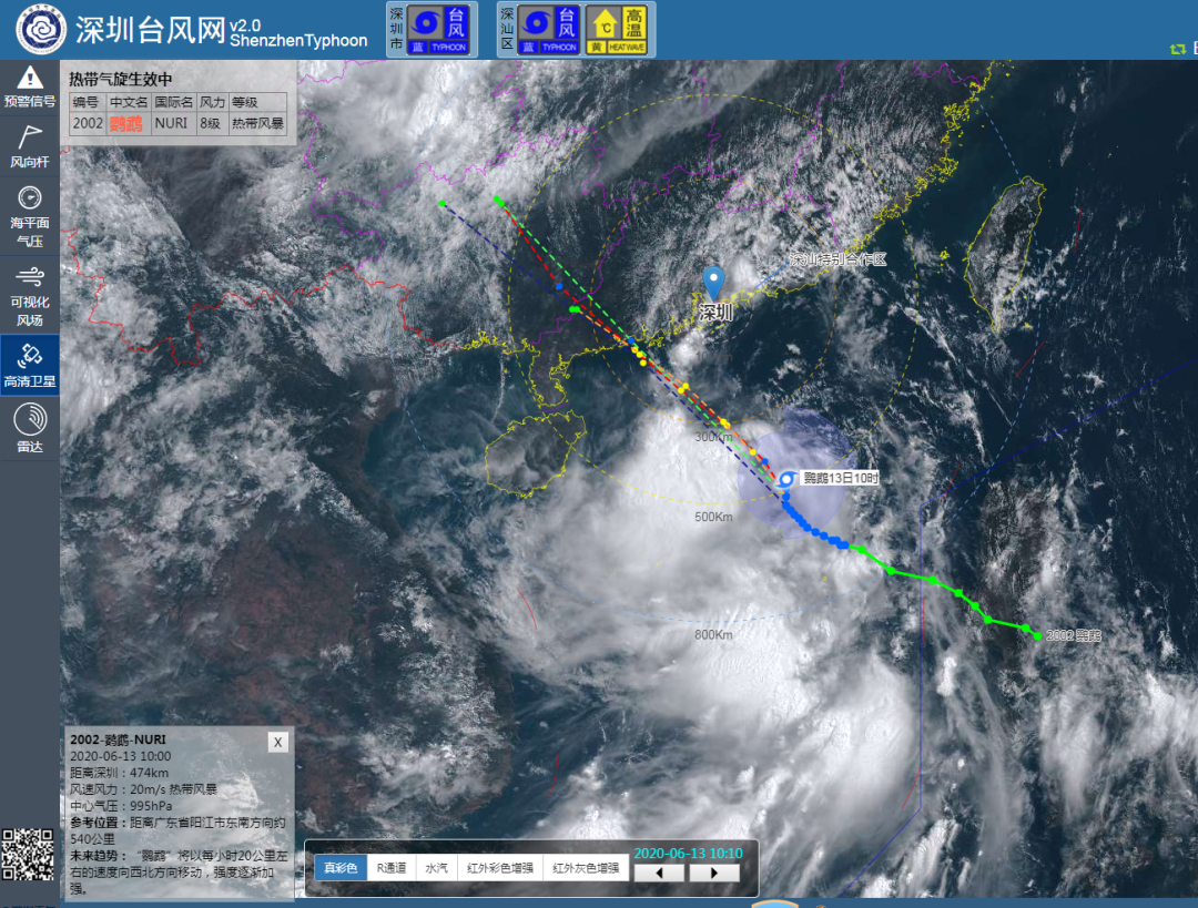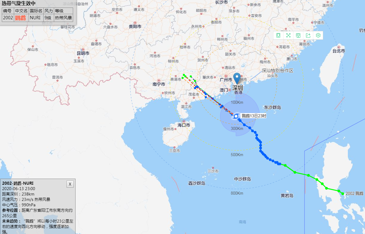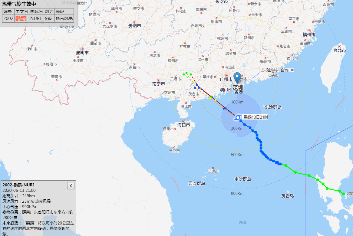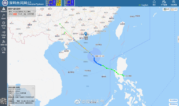 6月13日12時臺風(fēng)“鸚鵡”(熱帶風(fēng)暴級)位于深圳市東南方大約446公里的海面上,中心附近最大風(fēng)力8級。未來24小時趨向江門至茂名附近海域,最大可能在陽江附近登陸。我市13日17時前后起風(fēng)力逐漸加大,13日夜間至14日上午為風(fēng)雨主要影響時段。目前臺風(fēng)藍(lán)色預(yù)警信號生效中。深圳市氣象臺2020年06月13日12時35分發(fā)布。