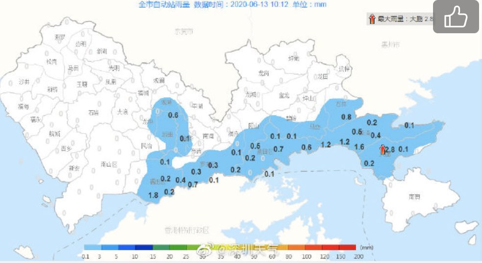 深圳市氣象臺2020年06月13日16時56分發(fā)布:預(yù)計17-20時,全市多云到陰天,有(雷)陣雨;降雨入夜后趨于明顯;偏東到東南風(fēng)4-5級,陣風(fēng)6-8級,風(fēng)力逐漸加大;目前全市雷電預(yù)警信號和臺風(fēng)藍(lán)色預(yù)警信號生效中,外出注意交通行駛安全。