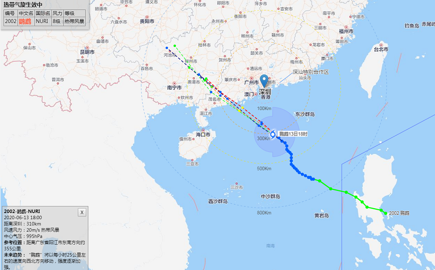 深圳市氣象臺2020年06月13日15時30分發(fā)布:6月13日15時臺風(fēng)“鸚鵡”(熱帶風(fēng)暴級)位于深圳市偏南方約387公里南海海面上,中心附近最大風(fēng)力8級。預(yù)計其將繼續(xù)向西北方向移動,14日白天趨向江門至茂名海域,最大可能以強(qiáng)熱帶風(fēng)暴級在陽江附近登陸。我市13日17時后起風(fēng)力逐漸加大,13日夜間至14日上午為風(fēng)雨主要影響時段,有大雨到暴雨,沿海和海區(qū)最大陣風(fēng)8-10級。目前臺風(fēng)藍(lán)色和雷電預(yù)警信號生效中。