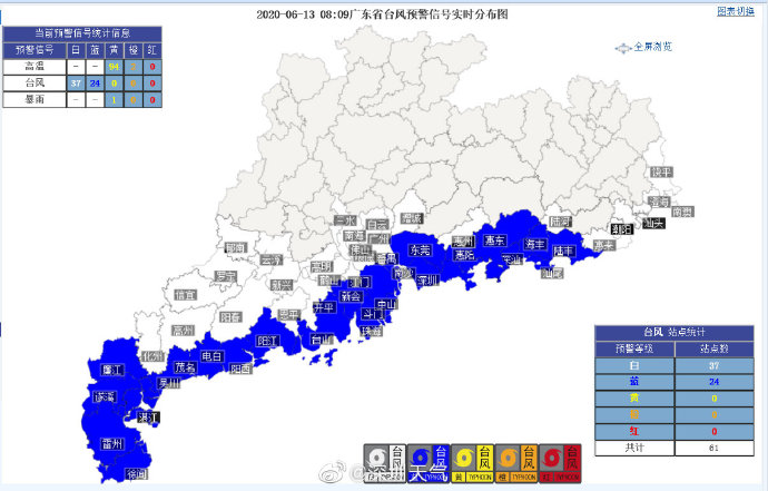 深圳市氣象臺于2020年06月13日07時15分將全市臺風(fēng)白色預(yù)警升級為藍(lán)色,預(yù)計受“鸚鵡”影響,今天傍晚起風(fēng)力逐漸加大,深圳市陣風(fēng)達(dá)8級以上,全市進(jìn)入臺風(fēng)戒備狀態(tài),落實各項防風(fēng)措施,及時組織戶外、高空、港口及海上作業(yè)人員做好防御工作。