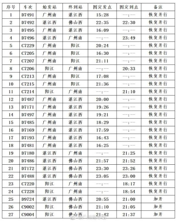其中,廣州南站恢復(fù)開行列車24趟,其中始發(fā)列車14趟,跨線列車4趟,終到列車6趟;同時加開跨線列車3趟,恢復(fù)開行和加開列車共計27趟。
