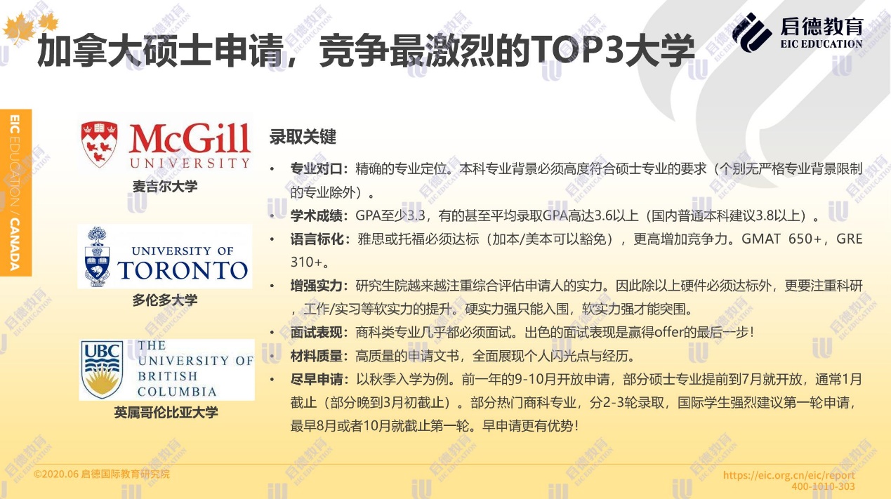 據(jù)啟德留學(xué)加拿大項目介紹,加拿大碩士申請競爭最激烈的三所大學(xué)為麥吉爾大學(xué)、多倫多大學(xué)與英屬哥倫比亞大學(xué)。申請人 GPA至少達(dá)到3.3,有的甚至要求平均錄取 GPA高達(dá)3.6以上(國內(nèi)普通本科建議3.8以上);雅思或托福必須達(dá)標(biāo)(加本 /美本可以豁免), GMAT650+, GRE310+;除硬件必須達(dá)標(biāo)外,加拿大名校注重科研、工作 /實習(xí)等軟實力的提升;商科類專業(yè)幾乎都必須面試。