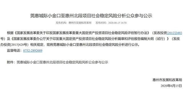 6月15日下午,惠州市發(fā)改局發(fā)布《莞惠城際小金口至惠州北段項(xiàng)目社會(huì)穩(wěn)定風(fēng)險(xiǎn)分析公眾參與公示》,征求公眾對(duì)項(xiàng)目建設(shè)的意見(jiàn)和建議。