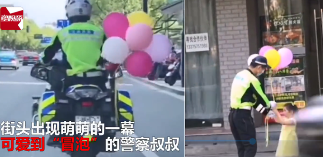 浙江交警叔叔在路邊收到小女孩送的氣球后,也暖了一路。