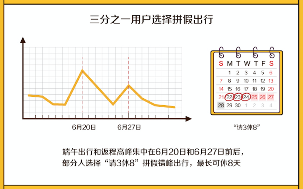 今年端午假期集中在周末,不少上班族會選擇“請3休8”拼假錯峰出行,享受8天超長假日。美團大數(shù)據(jù)顯示,端午出行和返程高峰分別集中在6月20日和6月27日前后,三分之一用戶會選擇拼假出行。