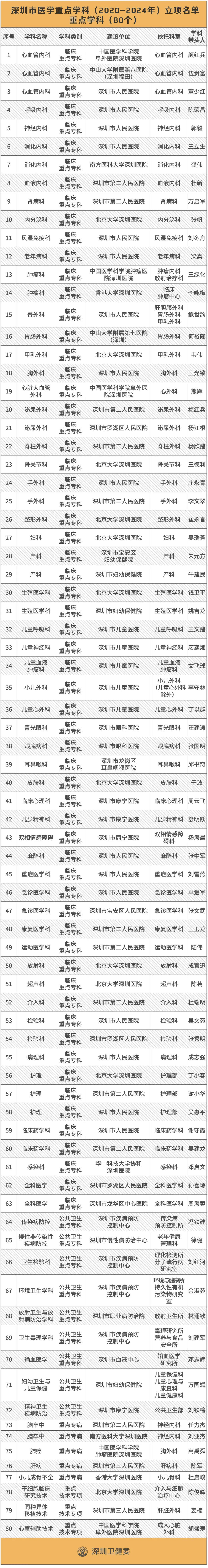 6月19日,深圳市衛(wèi)健委公布了2020-2024年的深圳市醫(yī)學(xué)重點(diǎn)學(xué)科立項(xiàng)名單,包括80個(gè)重點(diǎn)學(xué)科、15個(gè)重點(diǎn)培育學(xué)科。此外,深圳還有24個(gè)??迫脒x“省重點(diǎn)”名單,其中13個(gè)是國家衛(wèi)健委或國家中醫(yī)藥管理局認(rèn)定的國家級臨床重點(diǎn)???。這份名單是2019年由廣東省衛(wèi)健委公布的“廣東省高水平臨床重點(diǎn)??啤泵麊?。