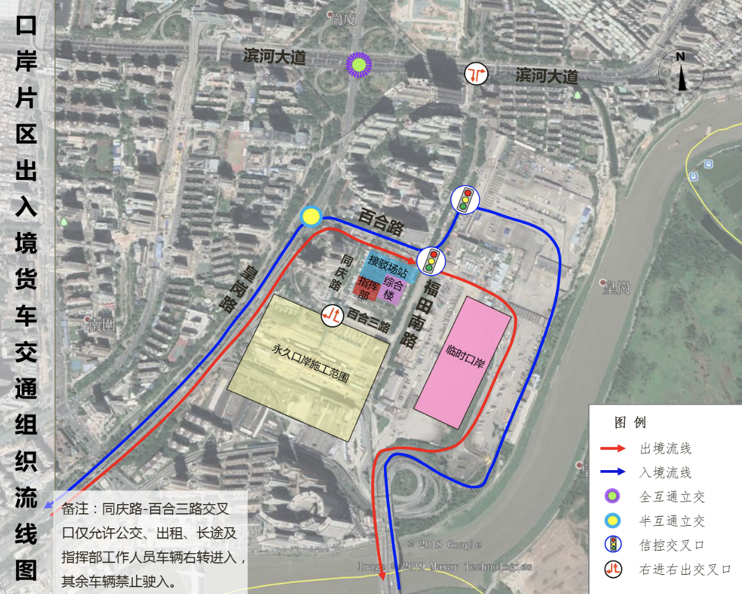 臨時(shí)口岸旅檢樓位于福田南路東側(cè),臨時(shí)交通接駁場站(公交場站、出租車場站、長途客運(yùn)站)位于福田南路西側(cè)、百合路路南側(cè)。