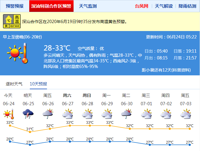 見(jiàn)圳客戶(hù)端?深圳新聞網(wǎng)2020年6月24日訊 據(jù)深圳市氣象局最新消息,深圳6月24日多云間晴天,天氣悶熱,偶有陣雨;氣溫28-33℃,中北部及人口密集區(qū)最高氣溫34-35℃;西南風(fēng)2-3級(jí),陣風(fēng)6級(jí);相對(duì)濕度65%-95%。