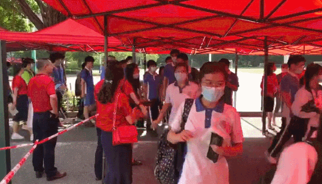 八點(diǎn)十分,學(xué)生走入考場(chǎng),身穿紅色衣服的老師在兩側(cè)為考生送上祝福?!凹佑停 薄袄蠋熚覀兂霭l(fā)了。”祝福聲此起彼伏。