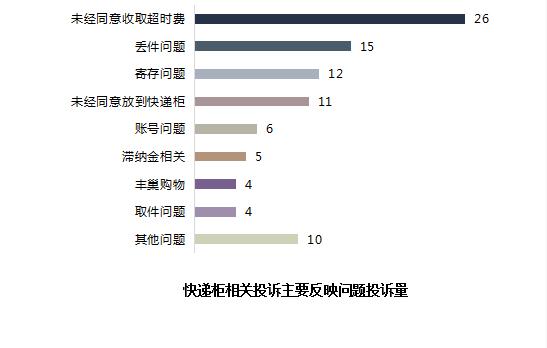 有關(guān)豐巢快遞柜未經(jīng)同意收取超時(shí)費(fèi)問(wèn)題的相關(guān)投訴比較突出,起因是豐巢在2020年5月開(kāi)始對(duì)非會(huì)員用戶在12小時(shí)后滯留快件收取0.5元/12小時(shí),3元封頂,部分消費(fèi)者認(rèn)為快遞公司未經(jīng)消費(fèi)者同意將快遞放至快遞柜且因?yàn)槌瑫r(shí)收取消費(fèi)者費(fèi)用造成部分消費(fèi)者的不滿。2020年5月9日,豐巢針對(duì)12小時(shí)保管期限相關(guān)服務(wù)做出說(shuō)明,并且告知消費(fèi)者快遞柜保管的具體收費(fèi)說(shuō)明。