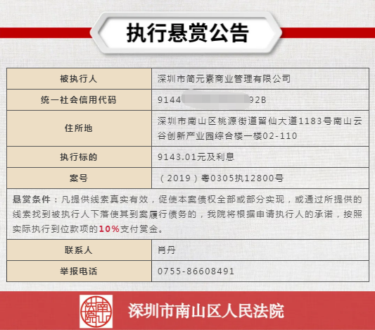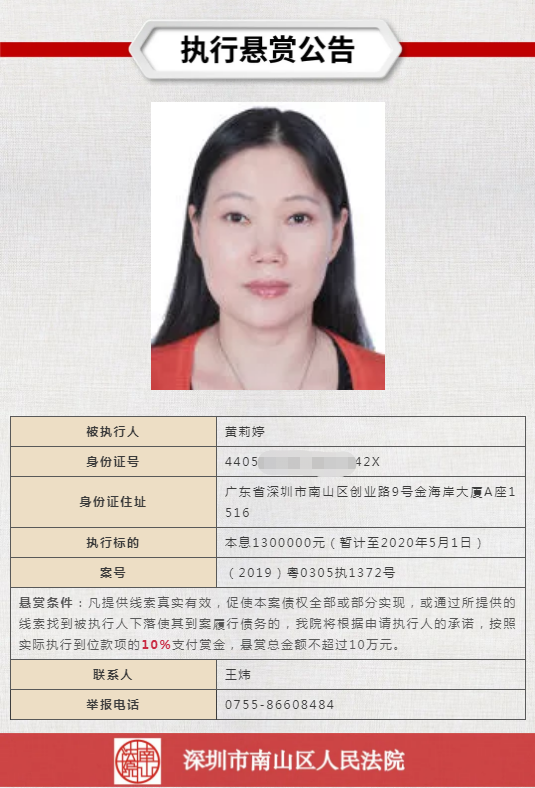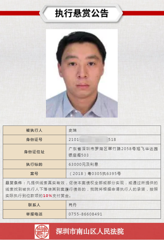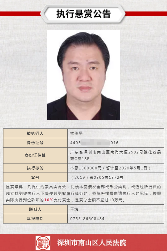 經(jīng)申請執(zhí)行人申請,深圳市南山區(qū)人民法院向社會發(fā)布懸賞舉報公告,凡提供線索真實有效,促使本案債權(quán)全部或部分實現(xiàn),或通過所提供的線索找到被執(zhí)行人下落使其到案履行債務(wù)的,深圳市南山區(qū)人民法院將根據(jù)申請執(zhí)行人的承諾,按照實際執(zhí)行到位款項給予一定金額的賞金。