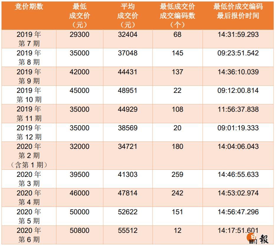 7月15日,2020年第7期普通小汽車增量指標(biāo)競(jìng)價(jià)公告發(fā)布,本期普通小汽車增量指標(biāo)共3346個(gè),其中個(gè)人指標(biāo)2945個(gè)。競(jìng)價(jià)時(shí)間定為7月27日9:00至15:00,連續(xù)進(jìn)行6個(gè)小時(shí),單位和個(gè)人在同一時(shí)間分別對(duì)相應(yīng)增量指標(biāo)進(jìn)行競(jìng)價(jià)。此前,第5期、第6期個(gè)人最低成交價(jià)均破5萬(wàn),創(chuàng)近一年新高。