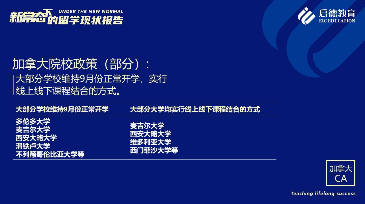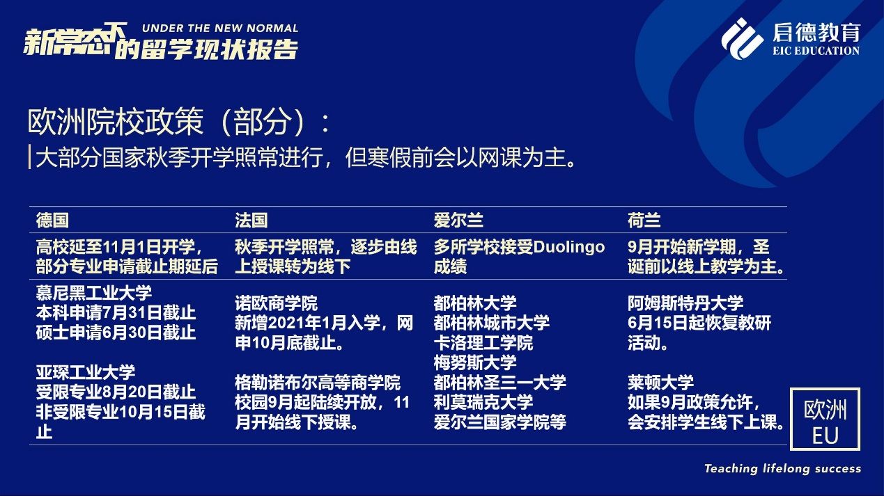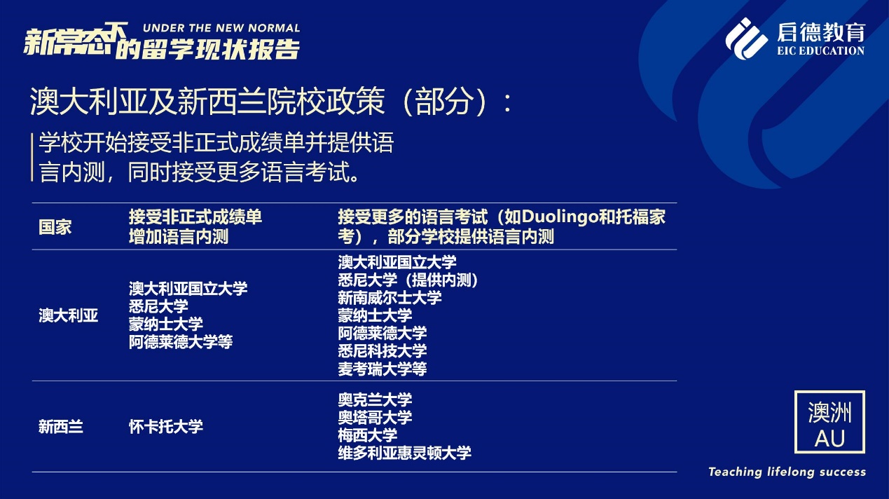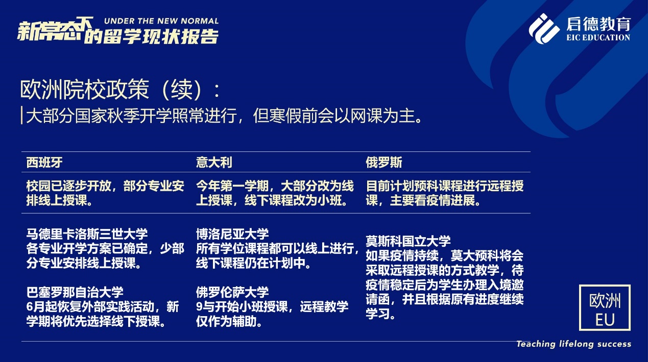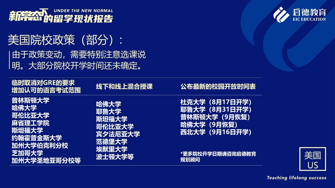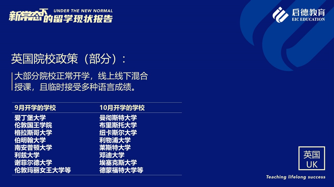 《報(bào)告》也梳理了近期各主要留學(xué)目的國(guó)及院校針對(duì)國(guó)際學(xué)生出臺(tái)的各類(lèi)政策。據(jù)啟德留學(xué)英愛(ài)項(xiàng)目總監(jiān)孫波介紹,國(guó)內(nèi)英國(guó)簽證中心已經(jīng)重新開(kāi)放。準(zhǔn)備赴英讀研的學(xué)生,部分大學(xué)明確表示秋季可以正常開(kāi)學(xué),大課將會(huì)采用線上授課的方式,小班授課線下進(jìn)行;還有部分大學(xué)向?qū)W生提供更加靈活的入讀方案,學(xué)生可以選擇9月入讀或者1月入讀。此外,從2021年開(kāi)始,在英國(guó)完成博士學(xué)位的國(guó)際學(xué)生將會(huì)獲得3年有效期的 PSW工作簽證,本科生和碩士生可以獲得2年有效期的 PSW工作簽證。
