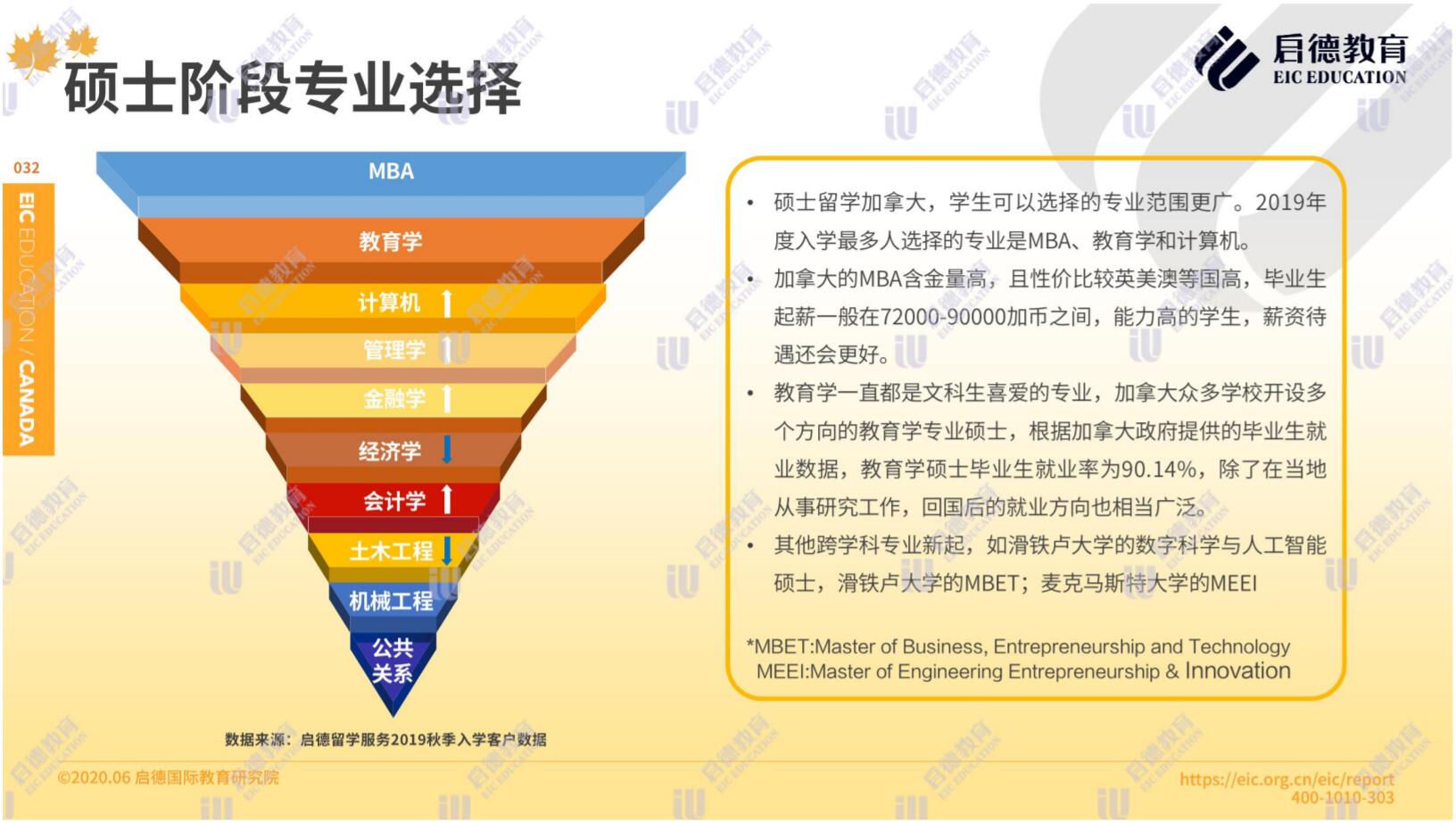 啟德加拿大2019秋季入學(xué)客戶(hù)服務(wù)數(shù)據(jù)顯示,在本科階段專(zhuān)業(yè)選擇理工科占比42%,商科占比37.1 %,文科19.1%,理工科的申請(qǐng)人數(shù)超過(guò)了商科。碩士階段選擇最多的專(zhuān)業(yè)是 MBA、教育學(xué)和計(jì)算機(jī),其他新興的跨學(xué)科專(zhuān)業(yè)包括滑鐵盧大學(xué)的數(shù)字科學(xué)與人工智能專(zhuān)業(yè)和商業(yè)、創(chuàng)業(yè)和技術(shù)專(zhuān)業(yè)( MBET ),麥克馬斯特大學(xué)的工程、創(chuàng)業(yè)與創(chuàng)新專(zhuān)業(yè)( MEEI )。
