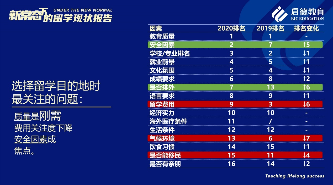 “安全因素”成為2020年中國(guó)學(xué)生在選擇留學(xué)目的地時(shí)最為關(guān)心的因素之一(排名第二),僅次于“教育質(zhì)量”(排名第一)。同時(shí),“是否排外”的排名也從2019年的第13位升至第7位。此外,在意向留學(xué)生希望就讀的學(xué)歷層次方面,2020年計(jì)劃攻讀研究生及以上學(xué)位的學(xué)生占比78.45 %,比2019年上升了0.75 %;攻讀本科(19.46 %)比2019年上升了0.96 %;而2020年計(jì)劃攻讀中學(xué)的比例(1.6%)有所下滑,比2019年下降了2.2%。