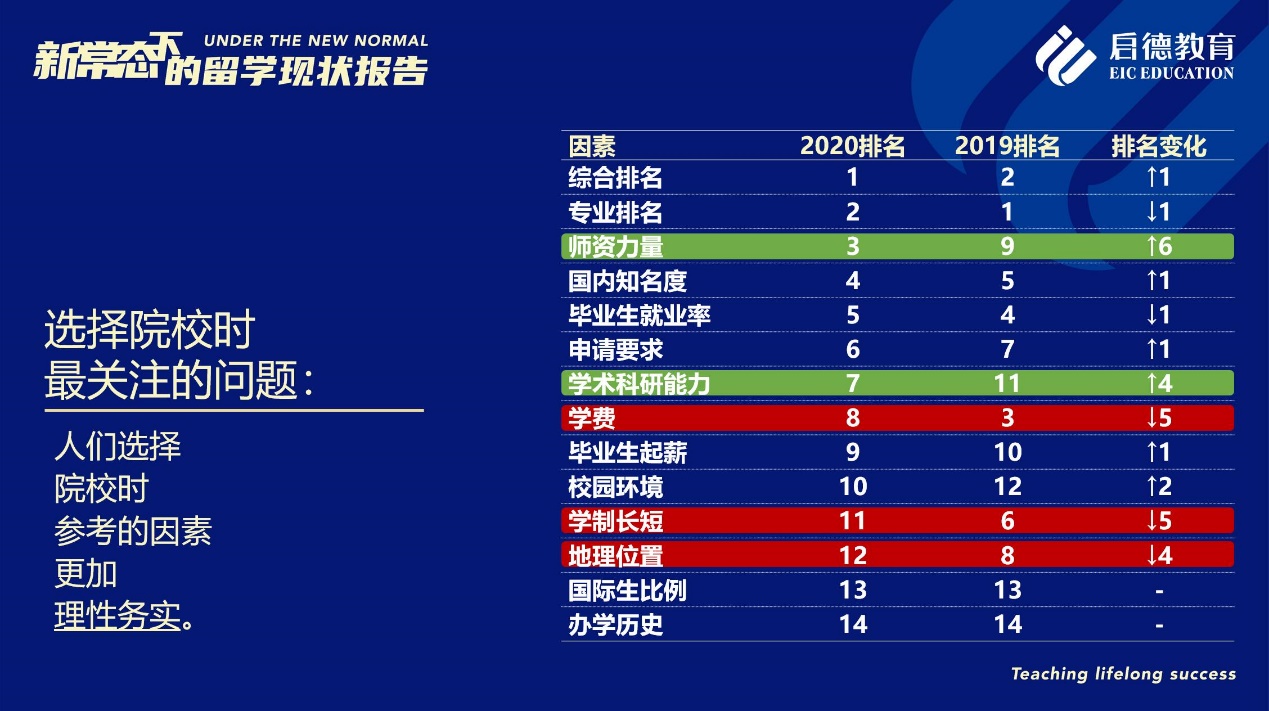 值得關(guān)注的是,在“選擇院校時(shí)最關(guān)注的問(wèn)題”中,“師資力量”的受關(guān)注度從2019年的第9位上升為第3位,僅次于“綜合排名”與“專(zhuān)業(yè)排名”,“國(guó)內(nèi)知名度”與“畢業(yè)生就業(yè)率”分居第4位與第5位,“學(xué)術(shù)科研能力”從2019年的第11位上升至第7位,而“學(xué)費(fèi)”、“學(xué)制長(zhǎng)短”與“地理位置”等因素分別下滑至第8位、第11位與第12位。可見(jiàn)在就業(yè)形勢(shì)尤其嚴(yán)峻的2020年,意向留學(xué)生對(duì)教育質(zhì)量的剛性需求已進(jìn)一步上升,以期在未來(lái)的就業(yè)市場(chǎng)獲得更具戰(zhàn)略?xún)?yōu)勢(shì)的國(guó)際競(jìng)爭(zhēng)力。
