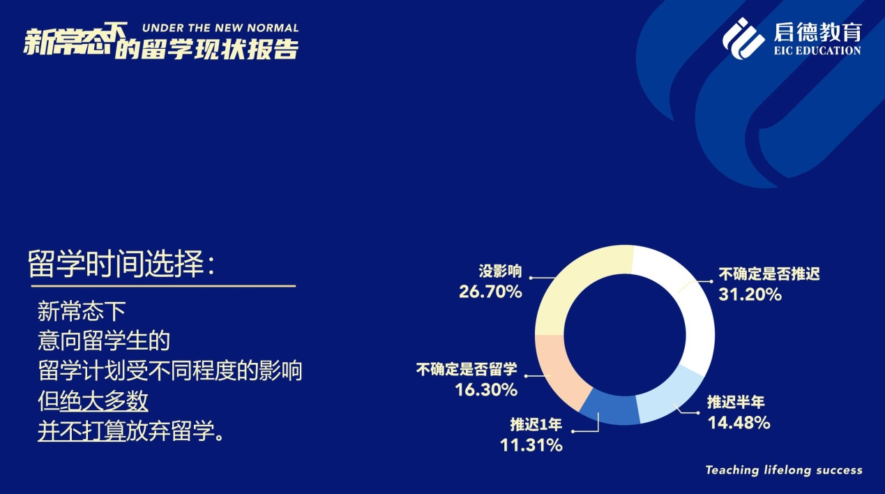 《啟德教育新常態(tài)下的留學(xué)現(xiàn)狀報(bào)告 》調(diào)研數(shù)據(jù)顯示,疫情與國(guó)際環(huán)境疊加的“新常態(tài)”中,意向留學(xué)生的留學(xué)計(jì)劃不同程度地受到了影響,但大部分的意向留學(xué)生并不打算放棄留學(xué),而主要是在時(shí)間規(guī)劃上進(jìn)行了調(diào)整。參與調(diào)研的意向留學(xué)生中,31.2%表示不確定是否推遲留學(xué)計(jì)劃,26.7%表示沒(méi)有影響,14.48%將留學(xué)計(jì)劃推遲半年,11.31%將留學(xué)計(jì)劃推遲一年,16.3 %表示不確定是否繼續(xù)留學(xué)(這之中初中階段的學(xué)生較多)。