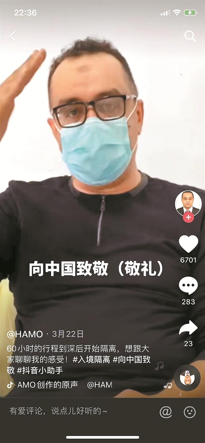 而在另一邊,方哈默也自愿當(dāng)起了中國防疫宣傳大使,他用短視頻在抖音記錄了中國抗疫暖心舉措,向國內(nèi)外宣傳羅湖各項防疫措施,截至目前,他在抖音已收獲了2.4萬的點贊量。網(wǎng)友們紛紛留下了暖心的鼓勵“謝謝你的理解”“歡迎你來到中國”?!拔蚁壬莻€比較開朗的人,也很喜歡中國的生活環(huán)境,喜歡中國人,我們周圍的鄰居、朋友對我們很好,沒有因為現(xiàn)在的疫情就歧視外國人或不敢靠近。所以他的心態(tài)一直都不錯?!狈焦奶嬖V記者,其實,對于她的丈夫來說,中國已經(jīng)是他的第二個家鄉(xiāng)。在疫情發(fā)生以來,他一直孜孜不倦地向所有朋友分享著中國政府在此次疫情中所做的努力和貢獻。