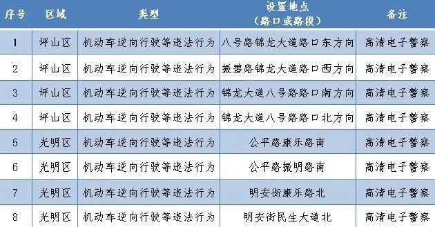 新增機(jī)動車逆行高清電警設(shè)備8套,其中坪山區(qū)新增4套,光明區(qū)新增4套。