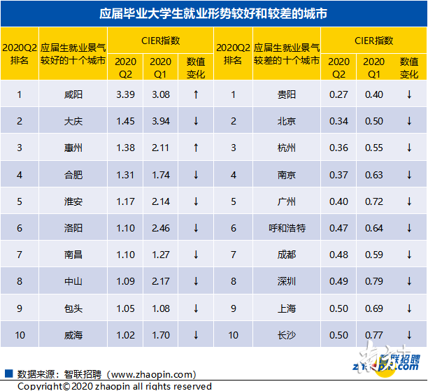 《報(bào)告》顯示,二季度應(yīng)屆生CIER指數(shù)較高的城市為二、三線城市,例如,咸陽、大慶、惠州、合肥和淮安等,這些城市的CIER指數(shù)均要高于1。而在應(yīng)屆生就業(yè)景氣較差的城市中,北上廣深等一線城市,以及杭州、南京、成都等新一線城市的應(yīng)屆生CIER指數(shù)相對較低,就業(yè)競爭相對激烈。