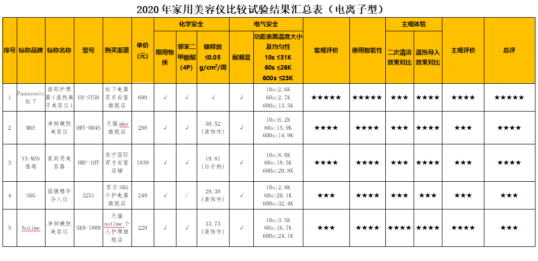 附:2020年家用美容儀比較試驗(yàn)結(jié)果匯總表(微電流型/電離子型)