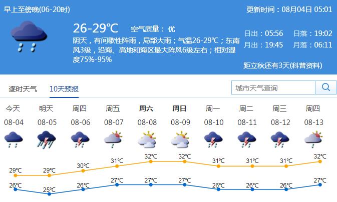 見圳客戶端·深圳新聞網(wǎng)2020年8月4日訊 今年第3號臺風(fēng)“森拉克”(熱帶風(fēng)暴級)已于8月2日14時40分前后在越南清化市登陸,并逐漸減弱消失。第4號臺風(fēng)“黑格比”(熱帶風(fēng)暴級)趨向華東沿海。據(jù)市氣象臺消息,4日有間歇性陣雨,局部大雨到暴雨,氣溫25-29℃;4日夜間起雨勢加強,5日有暴雨局部大暴雨,陣風(fēng)6-7級;6日白天起降水逐漸減弱,7-9日漸趨悶熱。