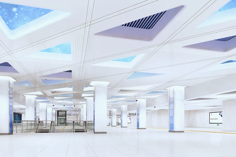 科學(xué)館站位于上步路與深南大道交叉口至濱河大道段,呈南北向布置。與1號線通道換乘,車站為地下三層單柱雙跨鋼筋混凝土框架結(jié)構(gòu),共設(shè)出入口6個(gè):E、F,物業(yè)口1、2、3、4。此外,與1號線換乘通道。