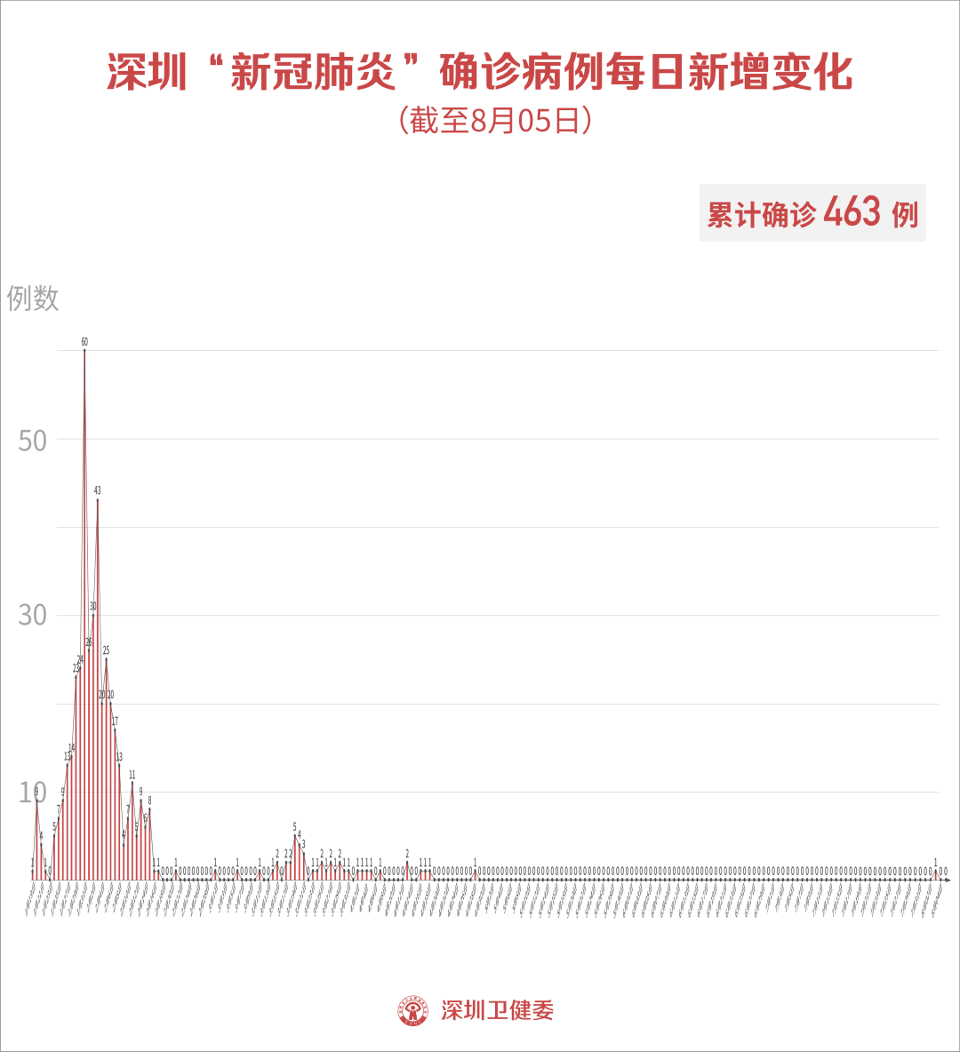 截至8月5日24時(shí),深圳市累計(jì)報(bào)告新冠肺炎確診病例463例。目前在院1例。