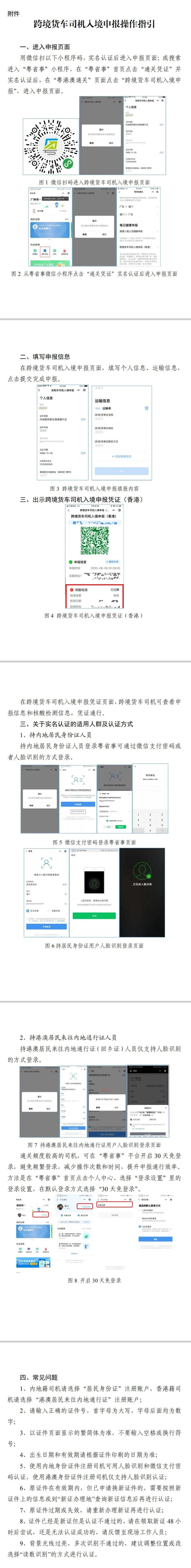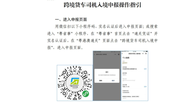 一、跨境司機(jī)入境前應(yīng)在“粵省事”微信小程序(粵省事—粵康碼—粵港澳通關(guān)—跨境貨車司機(jī)入境申報(bào))中準(zhǔn)確申報(bào)運(yùn)輸作業(yè)任務(wù)相關(guān)信息,包括作業(yè)目的地詳細(xì)信息(工廠/倉庫名稱及所在街道)、內(nèi)地手機(jī)號(hào)碼及相關(guān)個(gè)人信息,相關(guān)操作指引詳見附件。入境后所申報(bào)手機(jī)號(hào)碼將會(huì)接收提醒短信。未安裝GPS定位系統(tǒng)和ETC電子不停車收費(fèi)系統(tǒng)的入境貨車,需按照相關(guān)部門安排前往指定場地免費(fèi)安裝GPS和ETC系統(tǒng)。