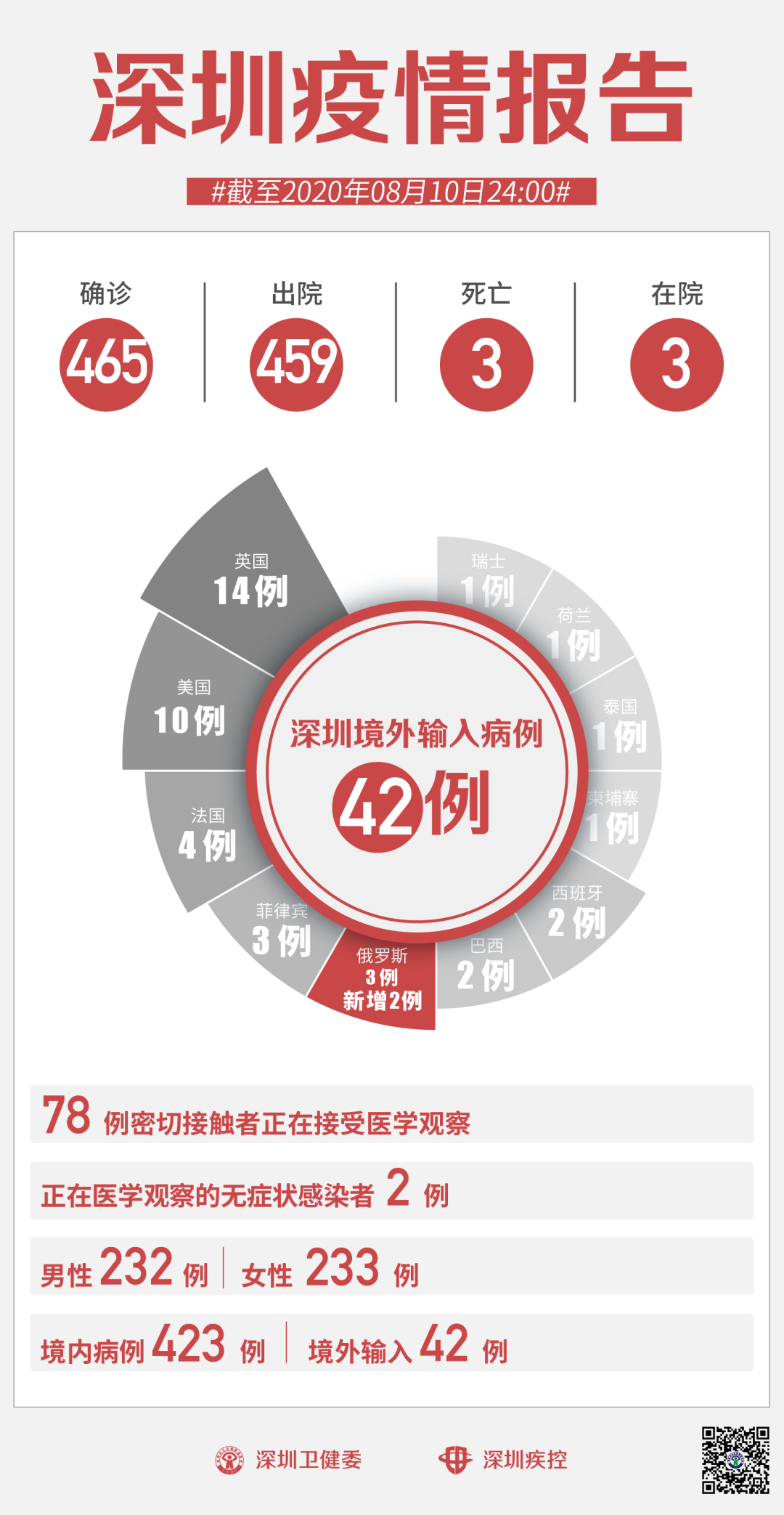 截至8月10日24時(shí),深圳市累計(jì)報(bào)告新冠肺炎確診病例465例。目前在院3例。