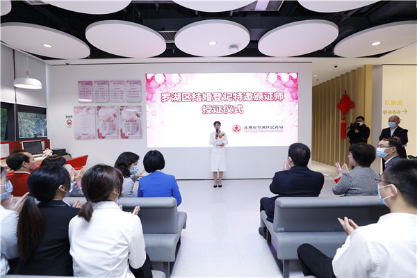 當(dāng)天,區(qū)委常委、宣傳部部長呂漫妮,區(qū)政府副區(qū)長左金平和銀婚老人楊明剛、李玉芳夫婦從區(qū)民政局局長楊文秀手中接過聘書,正式成為羅湖區(qū)結(jié)婚登記特邀頒證師,四位特邀頒證師依次為12對新人頒發(fā)結(jié)婚證,送上誠摯祝福。