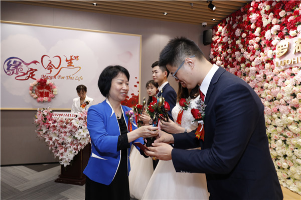 見圳客戶端·深圳新聞網(wǎng)12月12日訊(記者 李慧 通訊員 黎少忠 黃穎怡)“1212,要愛要愛!我們結(jié)婚啦!”,“雙十二”對大部分人來說是一個購物的好日子,但對打算步入婚姻的新人們來說,卻是一個不可錯過的登記好時機。12月12日,羅湖區(qū)婚姻登記處四處洋溢著歡樂的笑聲,12對新人在滿是玫瑰花的婚姻登記處中舉行集體結(jié)婚儀式。據(jù)悉,這也是疫情以來羅湖區(qū)首場結(jié)婚登記集體頒證儀式。