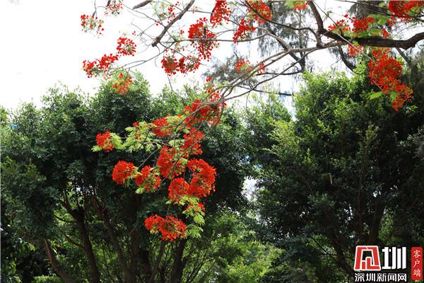 見圳客戶端·深圳新聞網(wǎng)5月18日訊(記者 李慧 見習(xí)記者 郝鈺詩 )又是一年五月天,春已盡,夏未央。伴隨深圳夏季而來的還有熱烈的鳳凰花?!叭~如飛凰之羽,花若丹鳳之冠?!痹谏钲诘脑S多地方,都種植了鳳凰木,五六月夏初之際,鳳凰花便開始掛滿枝頭,抬頭仰望便是紅彤彤的一片,就像太陽遺落在人間的衣裳,點(diǎn)綴著灣區(qū)之光。5月18日,深圳新聞網(wǎng)記者來到深圳東湖公園和洪湖公園,用鏡頭定格鳳凰花之美。