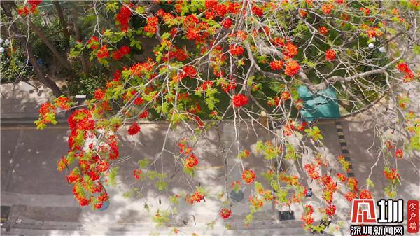 五月綻放全城的鳳凰花,映射著深圳這座城市的繁華與熱情,同時(shí)也給這座城市帶來勇敢熱烈的色彩。從鏡頭中可見,鳳凰花花團(tuán)緊簇,在藍(lán)天的襯托下,那一簇簇火紅的花海張揚(yáng)而又高調(diào)地綻放,為深圳“藍(lán)”染上了一抹紅。