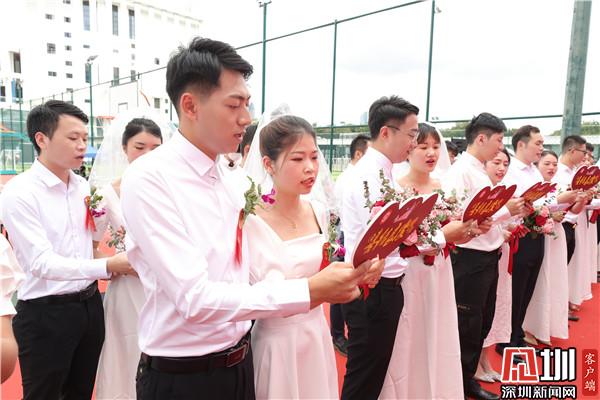 新郎身穿白襯衣,新娘身著潔白婚紗,他們十指緊扣,笑容甜蜜,在眾人的見證下交宣讀誓言、深情擁吻,許下一生愛的承諾。羅湖區(qū)副區(qū)長馮健和羅湖區(qū)民政局局長楊文秀作為特邀頒證師,分別為20對新人頒發(fā)結(jié)婚證書并送上誠摯的祝福,新人們的歡聲笑語充滿了婚姻登記處的每個角落,處處洋溢著幸福與喜悅。通過集體頒證莊嚴(yán)而神圣的儀式感,向新人們強調(diào)法律的嚴(yán)肅性和婚姻的莊嚴(yán)性,讓他們銘記婚姻家庭蘊含的責(zé)任與擔(dān)當(dāng),同時倡導(dǎo)廣大市民樹立“重登記、強責(zé)任、崇節(jié)儉”的婚俗新風(fēng)意識,形成婚事新辦、簡辦的文明新風(fēng)尚。