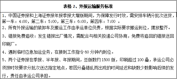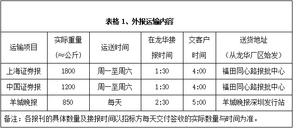 深圳報業(yè)集團印務有限公司現(xiàn)承印外報主要有上海證券報、中國證券報、羊城晚報等重要報刊,根據各報刊的具體要求,安全、準時、保質、保量地運送每天生產發(fā)行數量的各報刊到指定地點或客戶手中,具體運輸發(fā)行內容和標準詳見下面表格。