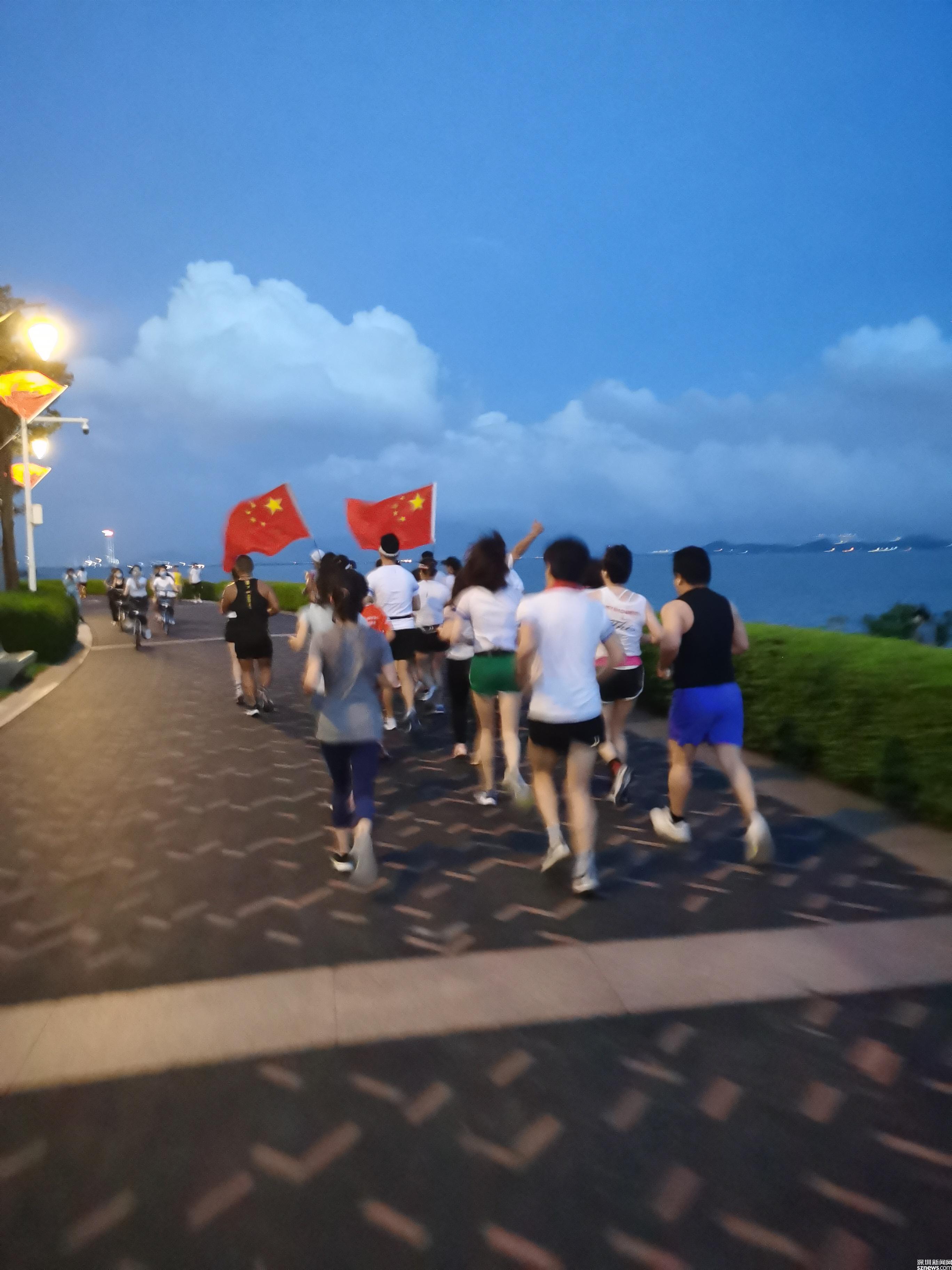 在海風(fēng)習(xí)習(xí)的深圳灣,20個(gè)人排成三隊(duì),在紅星紅旗的指引下,踏著統(tǒng)一的步伐,沿著海岸線跑了7.1公里。整齊的隊(duì)列,整齊的腳步聲,引起許多路人的關(guān)注和點(diǎn)贊。楊雨晨在心里唱著“沒有共產(chǎn)黨就就沒有新中國(guó)”,越跑越有力。