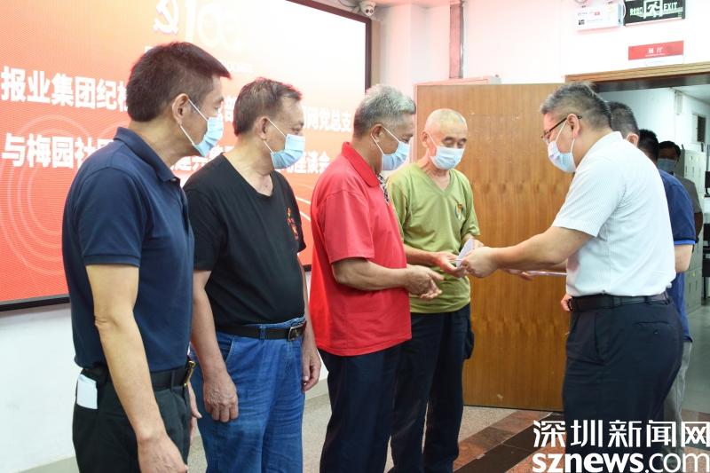 黨課結(jié)束后,陳鵬等代表深圳報(bào)業(yè)集團(tuán)一行對(duì)社區(qū)老黨員進(jìn)行慰問,并向老黨員代表送上慰問金和禮包,隨后,陳鵬向梅園社區(qū)“光榮在黨50年”老黨員們頒發(fā)紀(jì)念章,“你們辛苦了,我們要向你們學(xué)習(xí),希望你們注意身體,繼續(xù)為社區(qū)做貢獻(xiàn)?!标慁i捧起紀(jì)念章,為老黨員們戴上,并對(duì)老黨員們送上關(guān)心和祝福。