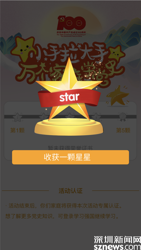 本次活動(dòng)面向羅湖轄區(qū)中小學(xué)學(xué)生及家庭。6月28日至7月8日,學(xué)生及家長(zhǎng)可以下載“羅湖Plus”APP,點(diǎn)擊首頁(yè)“服務(wù)”進(jìn)入“小手拉大手黨史學(xué)習(xí)”活動(dòng)專欄并完成注冊(cè)。活動(dòng)期間,每完成1次打卡即答對(duì)全部題目,可獲得1次親子“點(diǎn)亮星星”的機(jī)會(huì)。每輪答題如有1道答錯(cuò)即為“闖關(guān)失敗”,可以點(diǎn)擊“再來一次”繼續(xù)答題,直到全部答對(duì)為止。10天內(nèi)完成5次打卡任務(wù),即可點(diǎn)亮5顆小星星獲得“升旗手”個(gè)人榮譽(yù)證書。