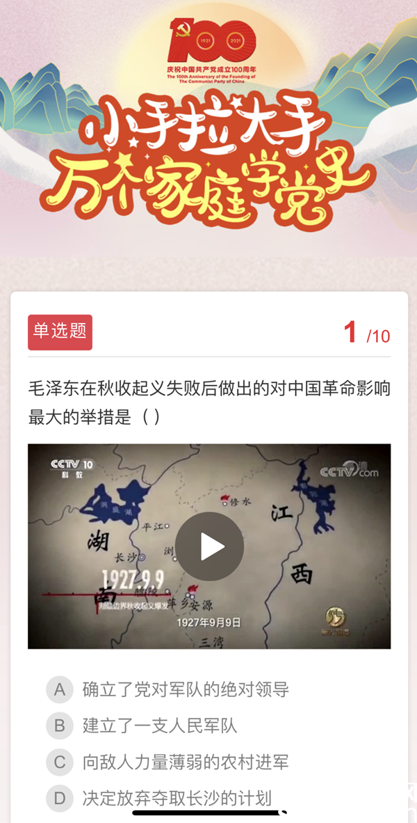 “‘小手拉大手’黨史學(xué)習(xí)形式很好,每天抽10分鐘和孩子一起答題闖關(guān)的時(shí)光是快樂的,題目難度不大,孩子基本都能答對(duì),闖關(guān)成功可以獲得星星,所以孩子興致很濃。”經(jīng)常和孩子一起答題的王子鑒父親接受記者采訪時(shí)說。