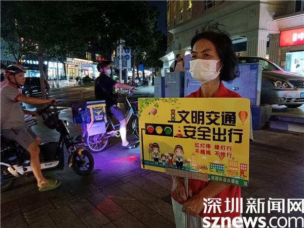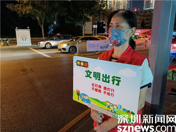 另一位堅(jiān)守在國(guó)慶假期里的義工是宣仲英,今年62歲。她一站兩個(gè)小時(shí),始終是精神抖擻,毫不松懈??吹接腥嗽噲D闖紅燈,她及時(shí)制止??吹接腥瞬蛔甙唏R線,她立刻提醒。她手持勸導(dǎo)文明出行的牌子,就像個(gè)交通警察,誰(shuí)也別想在她的面前犯規(guī)。本來(lái)下午6點(diǎn)鐘,正是她給家人做晚餐,同家人一起吃飯的時(shí)間,但她聽說(shuō)社區(qū)創(chuàng)文需要人,就跟家人商量,得到了家人的一致同意。她說(shuō),“我從內(nèi)地來(lái)到深圳,在老圍社區(qū)住了10年,感覺深圳做義工的氛圍特別濃厚,我也想做義工,為社會(huì)發(fā)揮余熱?!?/span>
