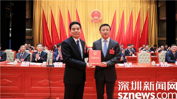 劉勝(左)為周益川(右)頒發(fā)當(dāng)選證書(shū)