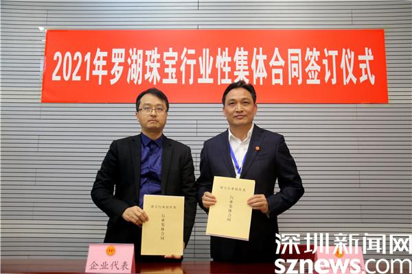 值得一提的是,本次大會還融合了職工權益保障、文明城市創(chuàng)建、企業(yè)服務等內容。在大會現(xiàn)場,舉行了“2021年羅湖區(qū)珠寶行業(yè)集體合同簽訂儀式”。簽訂儀式上,區(qū)珠寶工聯(lián)會主席、集體協(xié)商首席代表曾志斌和羅湖區(qū)珠寶企業(yè)協(xié)商首席代表周曉航共同簽訂了《2021年羅湖區(qū)珠寶行業(yè)集體合同》,切實保障了轄區(qū)珠寶企業(yè)職工合法權益;隨后,由“廣東省五一勞動獎章”獲得者郭夷錟宣讀了主題為《攜手新征程,共創(chuàng)新未來》的行業(yè)倡議書,號召全區(qū)珠寶企業(yè)和職工,在深入學習貫徹習近平新時代中國特色社會主義思想、愛崗敬業(yè)、敢為人先、誠信經(jīng)營等方面爭做表率;同時,為更好地服務轄區(qū)企業(yè),大會特地邀請了羅湖區(qū)企業(yè)服務中心陳良同志為與會代表介紹企業(yè)服務平臺建設與運用情況。
