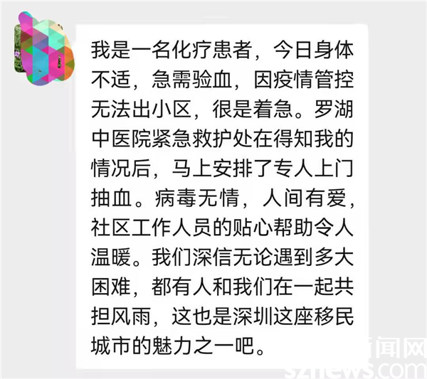 葉先生在護(hù)士為他抽血離開之后,送上了真摯地感謝?!盁o論我們遇到多大的苦難總會有人和我們一起共擔(dān)風(fēng)雨,這就是深圳的魅力”,葉先生說到。