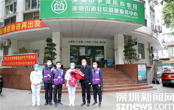 1月13日是王津原定舉行婚禮的日期,她仍然沒有例外地出現(xiàn)在蓮塘社康的采樣隊伍中。盡管不能出現(xiàn)在婚宴現(xiàn)場,但是并肩作戰(zhàn)的社康同事給王津錄了一個祝福視頻給她祝賀,羅湖醫(yī)院集團黨委書記、院長孫喜琢也來到蓮塘社康,向依然堅守崗位的新娘王津送上了鮮花和新婚祝福,感謝她的辛勤付出,并對所有在抗疫一線的醫(yī)務(wù)工作者表示感謝,“是你們在守護羅湖、守護深圳的安全,你們辛苦了!”